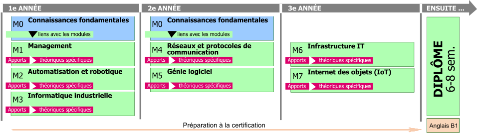 Les modules 0 et 1 sont purement théoriques. Tandis que les autres seront à la fois enseignés en salle de théorie, mais aussi en les pratiquant en laboratoire.