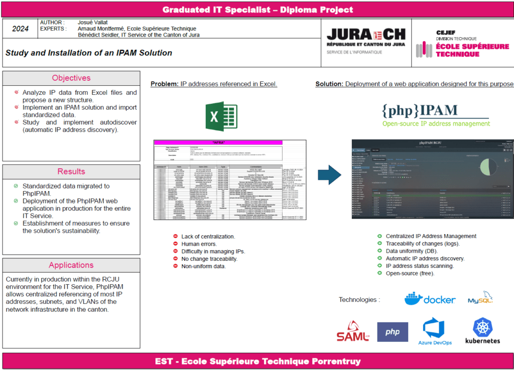 Arrivant en fin de formation, l’étudiant devra effectuer un travail de diplôme dans une entreprise tierce. Permettant ainsi de valider les connaissances acquises durant ses années de formation. Idem que pour le stage, les domaines sont très variés.